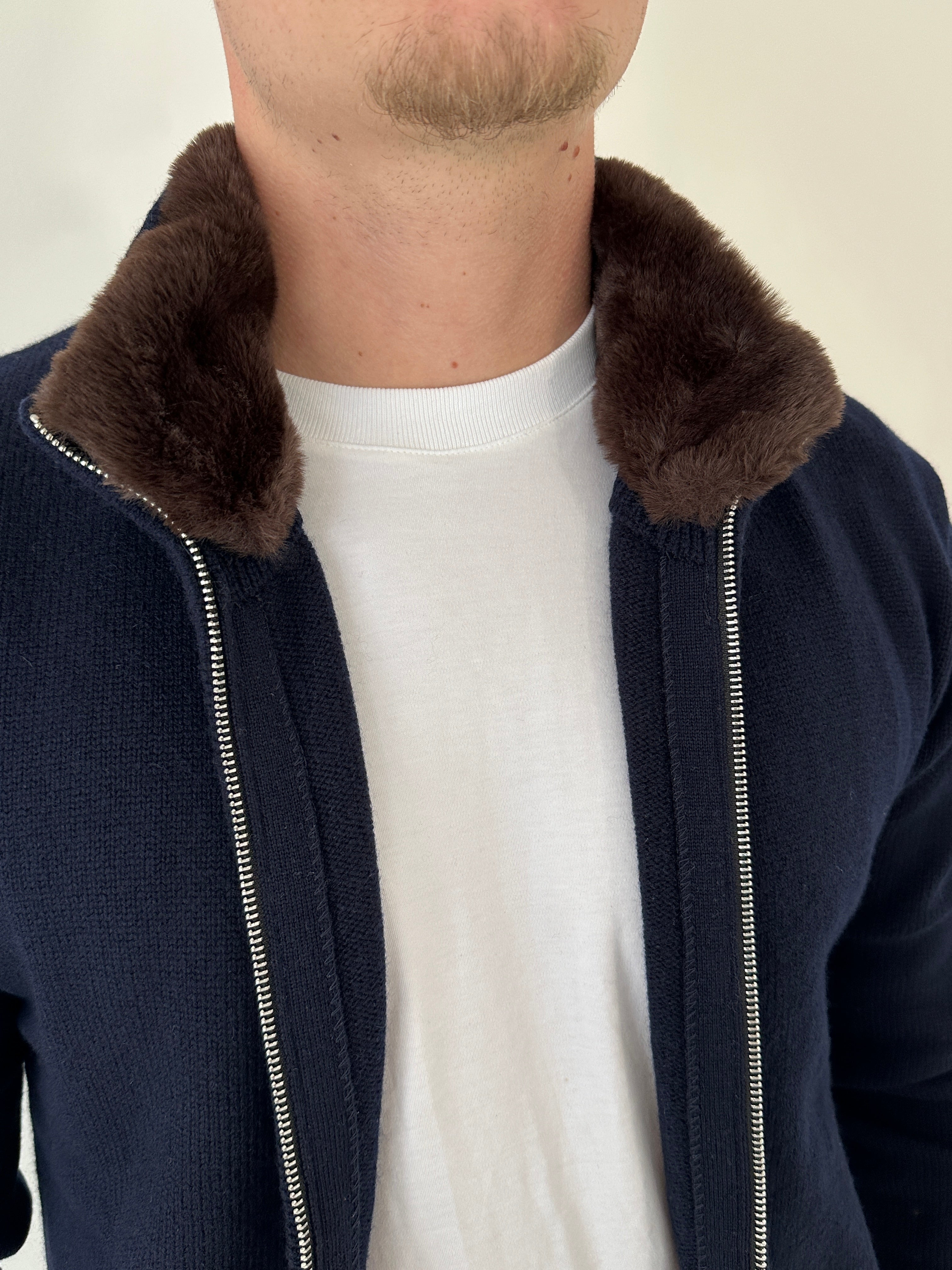 This blouson embodies refined minimalism and craftsmanship. Cut from pure merino wool, it offers exceptional softness and comfort. The subtle texture and fur collar add sophistication and warmth, while a smooth two-way zipper and ribbed hems complete an understated, versatile silhouette.